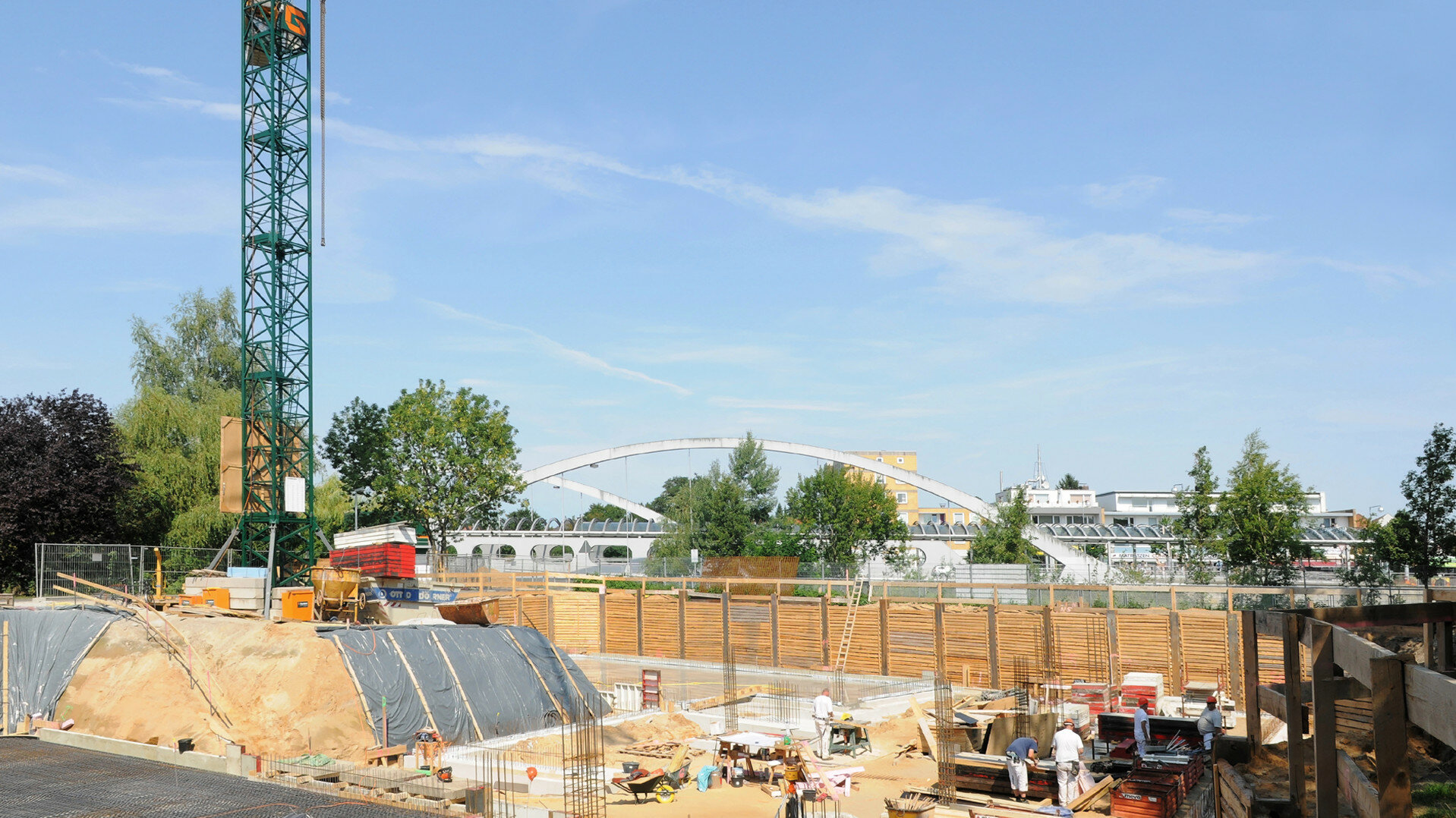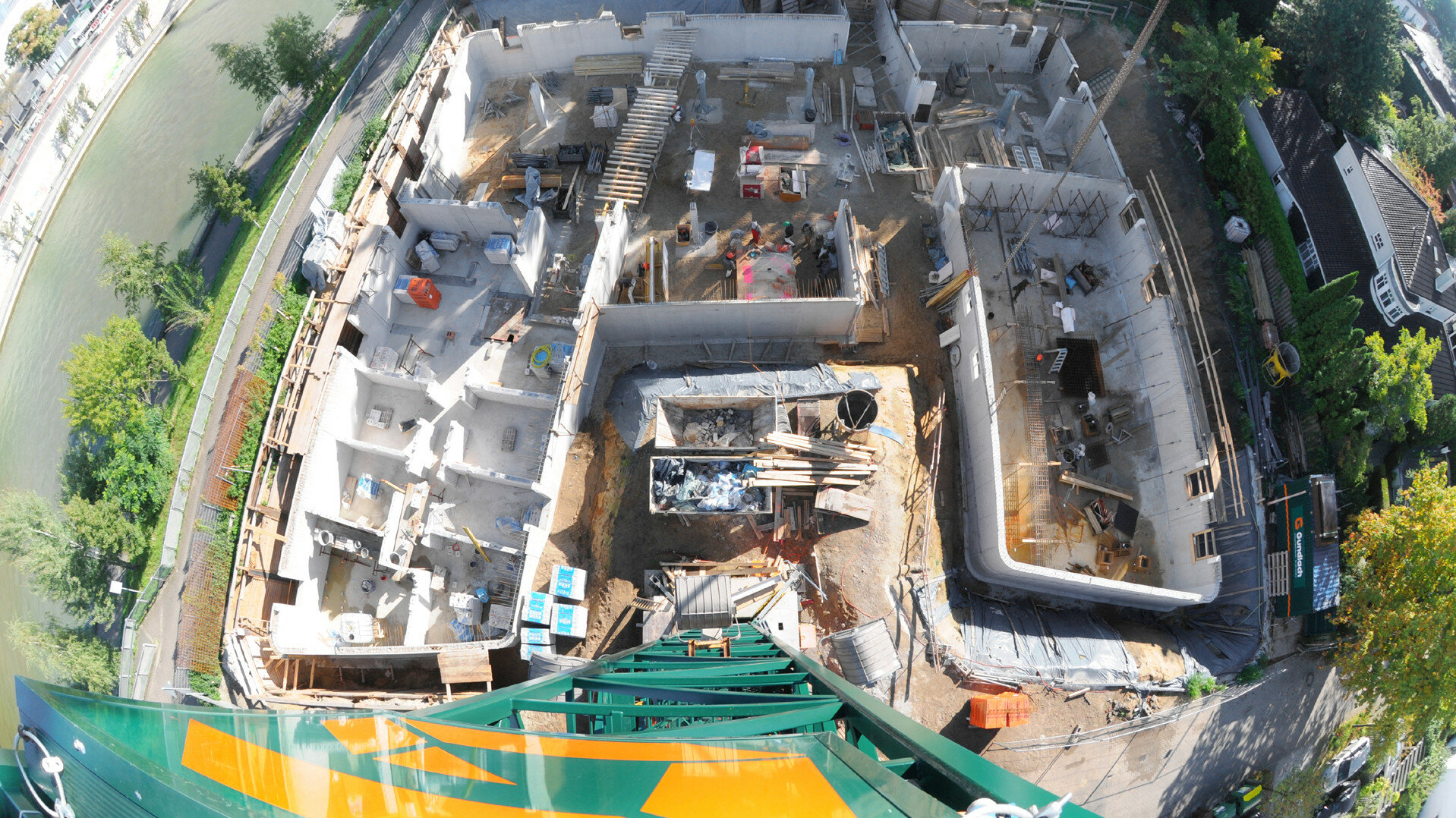 - Lagebedingt geringer Platz für Baustelleneinrichtung u. Zufahrten und damit erschwerte logistische Versorgung der Einzelgewerke im Rohbau und Ausbau