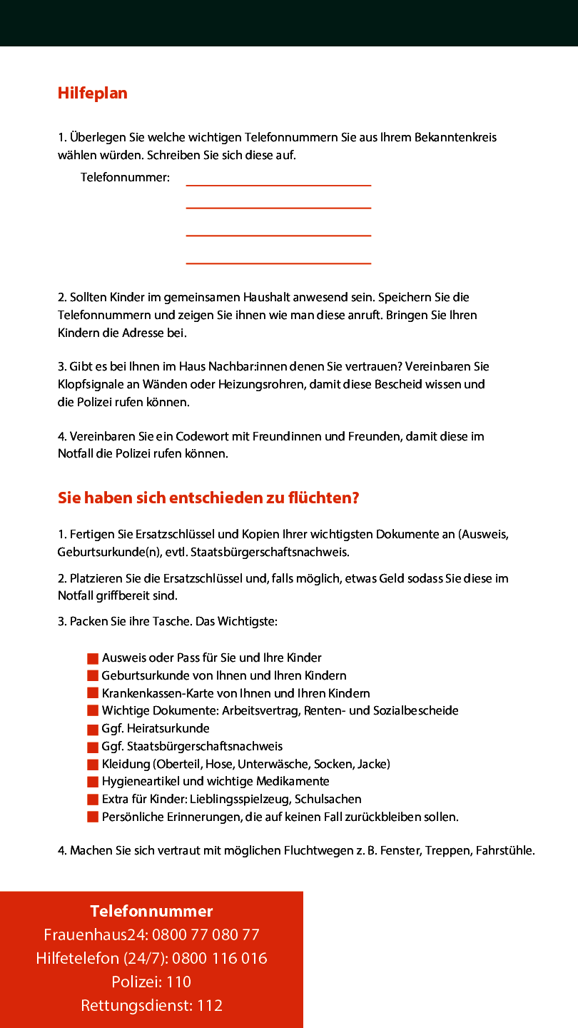 Sollten Sie sich gerade in einer Notfallsituation befinden, sperren Sie sich im Zimmer ein und rufen die Polizei! Falls möglich, verlassen Sie die Wohnung.