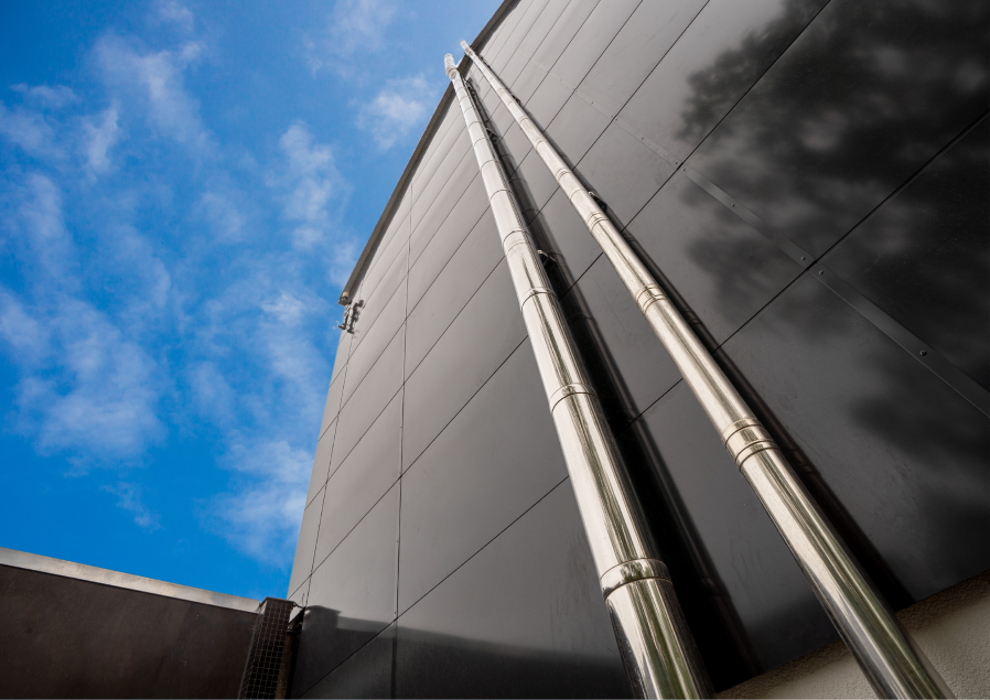 Es geht aber nicht nur um Funktionalität, sondern auch um Ästhetik: An der Fassade werden schlichte, schwarz-beschichtete Metallplatten des Herstellers Systea angebracht. Sie wirken wie moderne Designelemente und fügen sich in die Architektur ein. Sie unterscheiden sich deutlich von klassischen Sonnenkollektoren. Dahinter steckt aber präzise Planung: Unsichtbar wandeln die Paneele die Sonnenkraft in Wärmeenergie um. Die so erzeugte Wärme unterstützt das Kernelement des mehrschichtigen Nahwärmenetzes: eine Erdwärmepumpe.