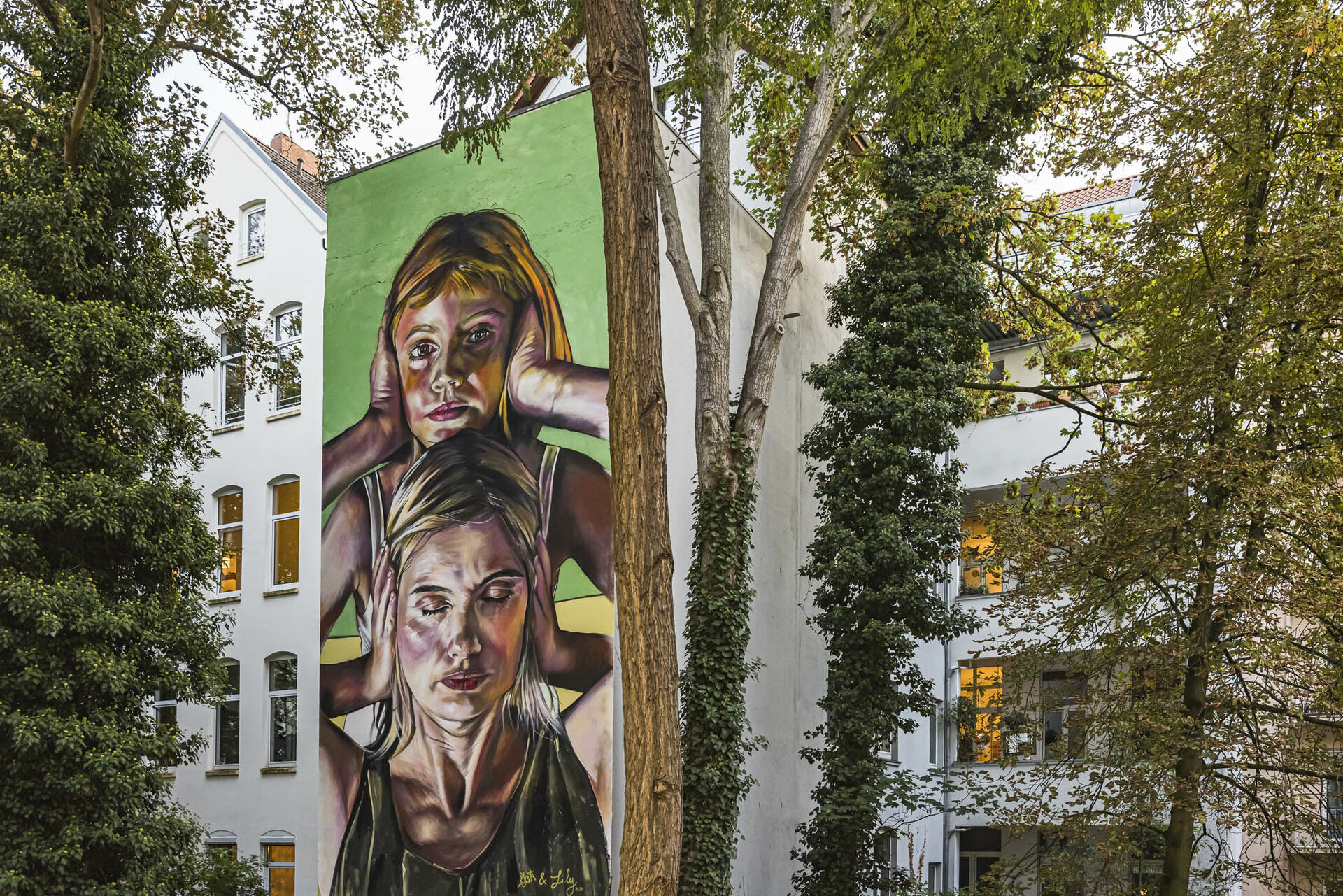 Für das Hola-Utopia-Festival 2022, das von Gundlach gesponsert wurde, hatte sie sich ein besonderes Kunstwerk ausgewählt. Es zeigt eine Mutter mit ihrer Tochter. Beide halten sich gegenseitig die Ohren zu.
