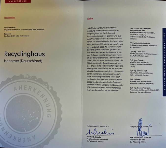 Das Recyclinghaus hat beim Gestaltungspreis der Wüstenrot-Stiftung 2023 eine „Anerkennung“ erhalten. Gesucht wurden zukunftsfähige Einfamilienhäuser in Deutschland, Österreich und der Schweiz. Die Jury lobte das Recyclinghaus als „beispielgebendes Demonstrationsobjekt, das zudem vor allem im Innern die Möglichkeiten des Recyclings nutzt, um eine angenehme und abwechslungsreiche Atmosphäre zu schaffen“