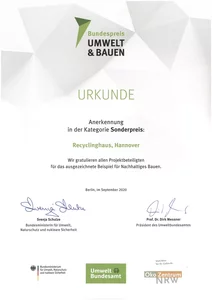 Recyclinghaus am Kronsberg erhält Sonderpreis "UMWELT UND BAUEN" vom Bundesministerium für Umwelt, Naturschutz und nukleare Sicherheit (BMU)