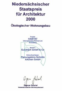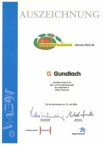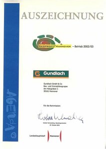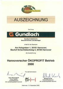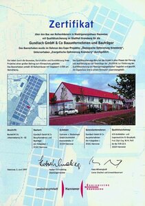 Zertifikat über den Bau von Reihenhäusern in Niedrigenergie-Bauweise mit Qualitätssicherung im Stadtteil Kronsberg für die Gundlach GmbH & Co Bauunternehmen und Bauträger.