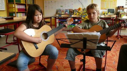Die Kinder machen Musik auf den Instrumenten Cello, Violine, Gitarre, Blockflöte, Akkordeon und Klavier / Keyboard. Anhand kleiner Tänze, Lieder und Klanggeschichten werden die Spielmöglichkeiten der Instrumente untersucht, entdeckt und ausprobiert. Ziel dieses viermonatigen Unterrichtsangebotes ist, mit altersgerechten Stücken Lust und Interesse am gemeinsamen Musizieren zu wecken. Die Instrumente werden den Kindern leihweise zur Verfügung gestellt, so dass jedes Kind die Möglichkeit hat, sich für eine ganze Unterrichtseinheit mit seinem Instrument improvisatorisch frei oder nach exakter Anweisung zu beschäftigen.