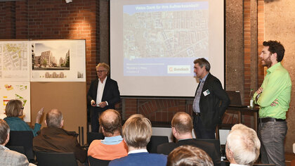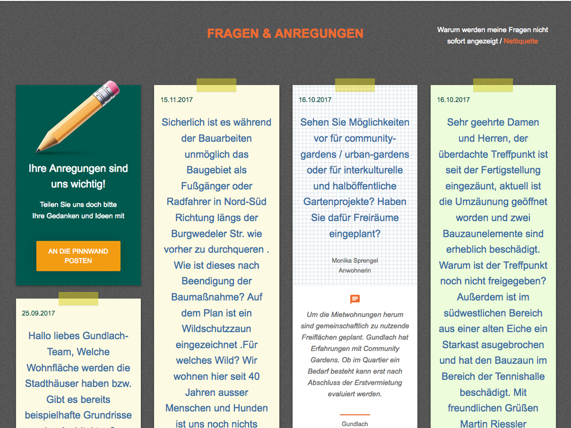 Idee: Nachbarschaft ist wichtig. Sie begründet sich schon frühzeitig in der Planungs- und Bauphase. Von den zukünftigen Nachbarn und Bewohnern kommen gute Hinweise für lebenswerte Quartiere – die wir gerne aufnehmen, wo immer es möglich ist. Die Internetseite Auf-gute-Nachbarschaft.info informiert über die aktuellen Projekte, listet häufig gestellte Fragen, gibt einen Überblick über die kommenden Umsetzungsphasen. Eine Pinwand gibt die Möglichkeit, Fragen und Anregungen öffentlich zu posten.