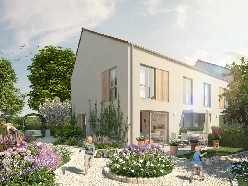 Idee/Konzeption: Familienfreundliche Siedlung mit hohem Aufenthaltswert im Freien und zusätzlicher Familienförderung, je im Haushalt lebendem Kind Kaufpreis um 10.000 Euro reduziert (insgesamt 520.000 Euro).