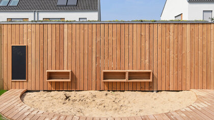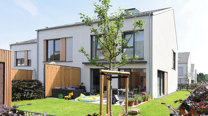 Im Preis enthalten: Carport, Abstellraum mit extensiv begrüntem Dach und Gartengestaltung mit Obstbaum, gasbetriebenes Blockheizkraftwerk, 2 kindgerechte Spielplätze