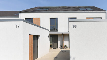 Umfang: 8 Doppelhaushälften und 32 Reihenhäuser in verschiedenen Hausbreiten, aufgelockerte Bebauung durch 2 Wohnhöfe und private Anliegerstraßen