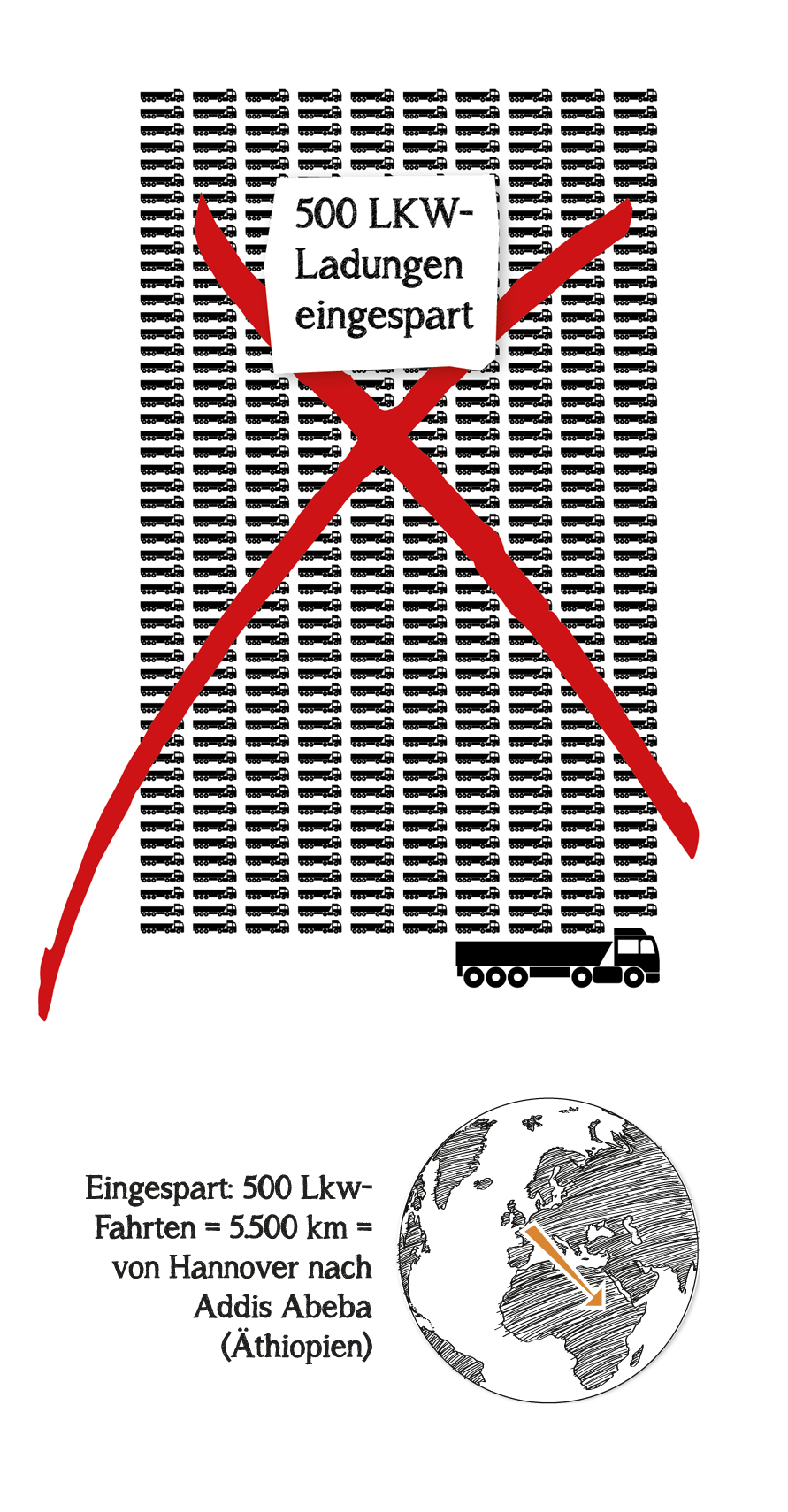 Das entspricht einer Einsparung von 5.500 km Transportstrecke und 500 Lkw-Ladungen und damit: 7.600 kg CO2