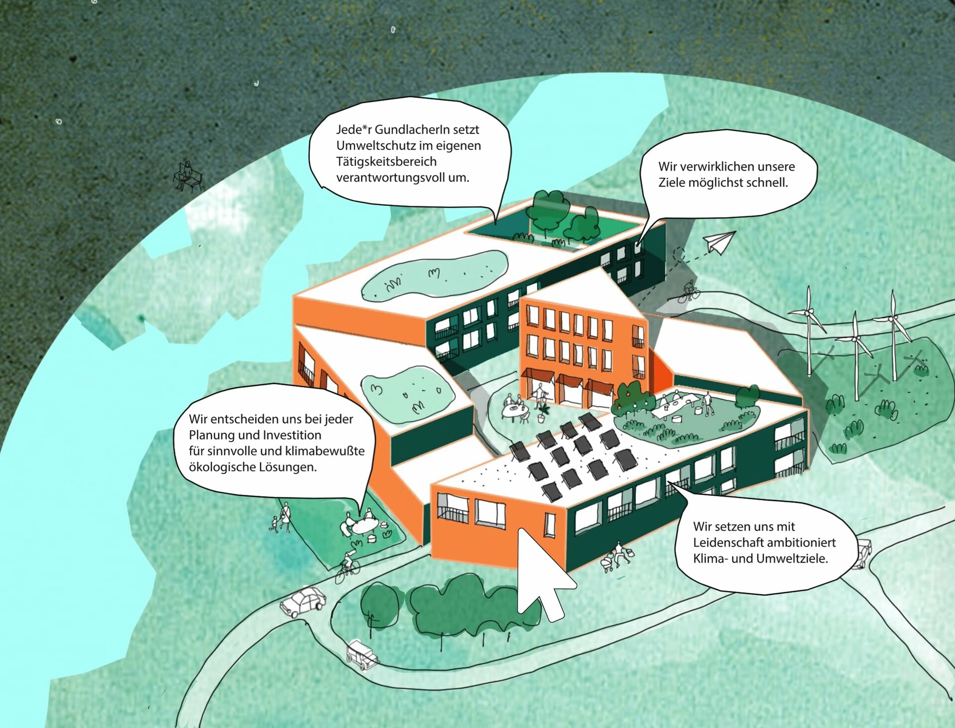 Unsere Haltung: Umweltschutz und Ressourcensparendes Verhalten wird immer wichtiger. Wir wollen einen positiven Beitrag leisten. Ökologisches Denken und Handeln soll Grundlage aller Unternehmensprozesse sein. Regionale Materialien und Lieferanten sind unsere erste Wahl. Unsere Häuser und ihr Umfeld sollen einen hohen Erlebnis- und Nutzwert haben. Wir denken ganzheitlich, also auch in Mobilität, Versorgung, Biodiversität, Mikroklima.