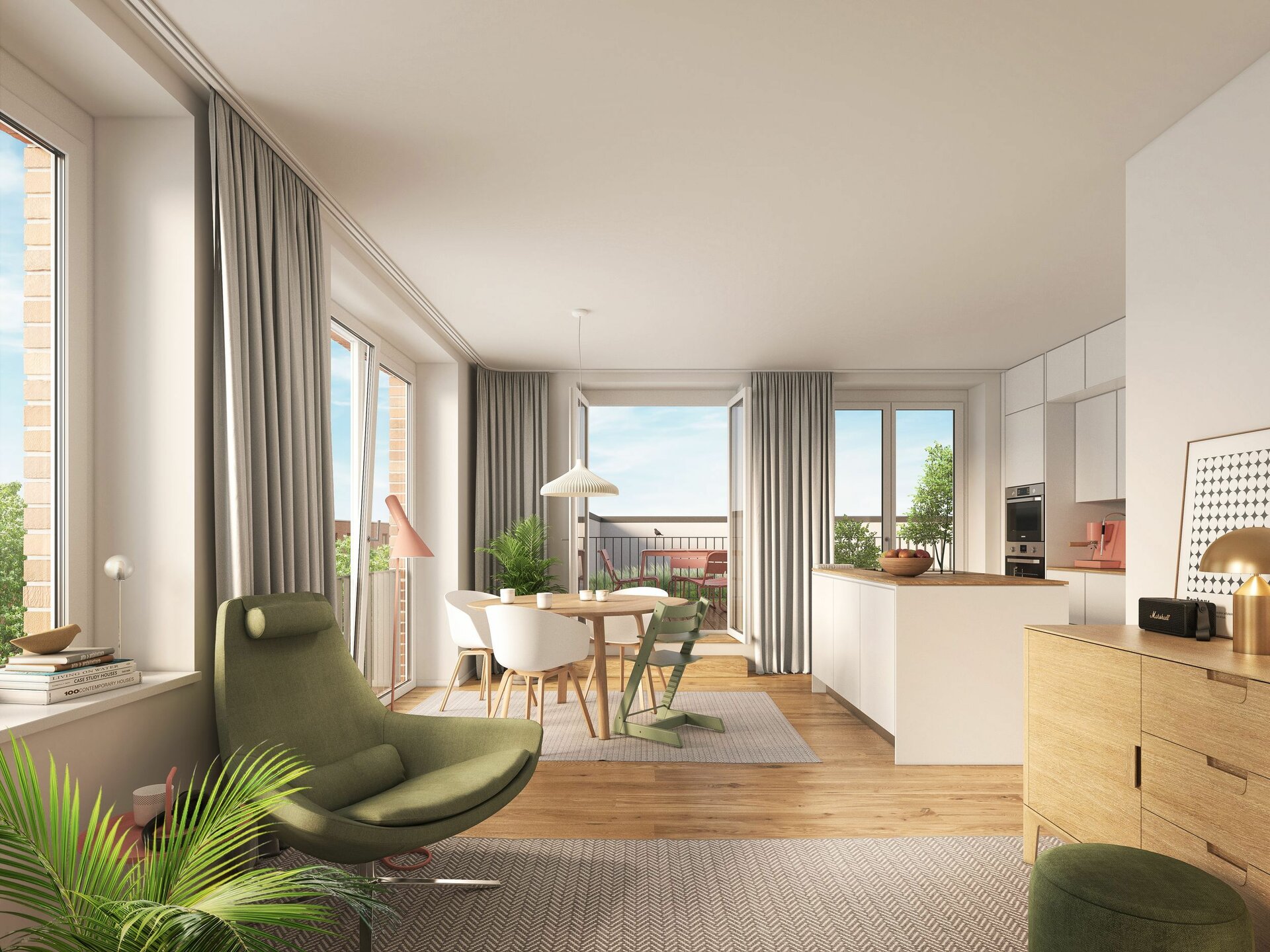 Die großzügig gestalteten Außenanlagen, entworfen von den renommierten nsp Landschaftsarchitekten, bieten Ihnen Raum für Erholung und Begegnung. Betonsitzblöcke, Spielplätze und Sitzbänke laden zum Verweilen und zum Austausch mit Nachbarn ein – ein Quartier, in dem Sie sich von Anfang an zuhause fühlen.