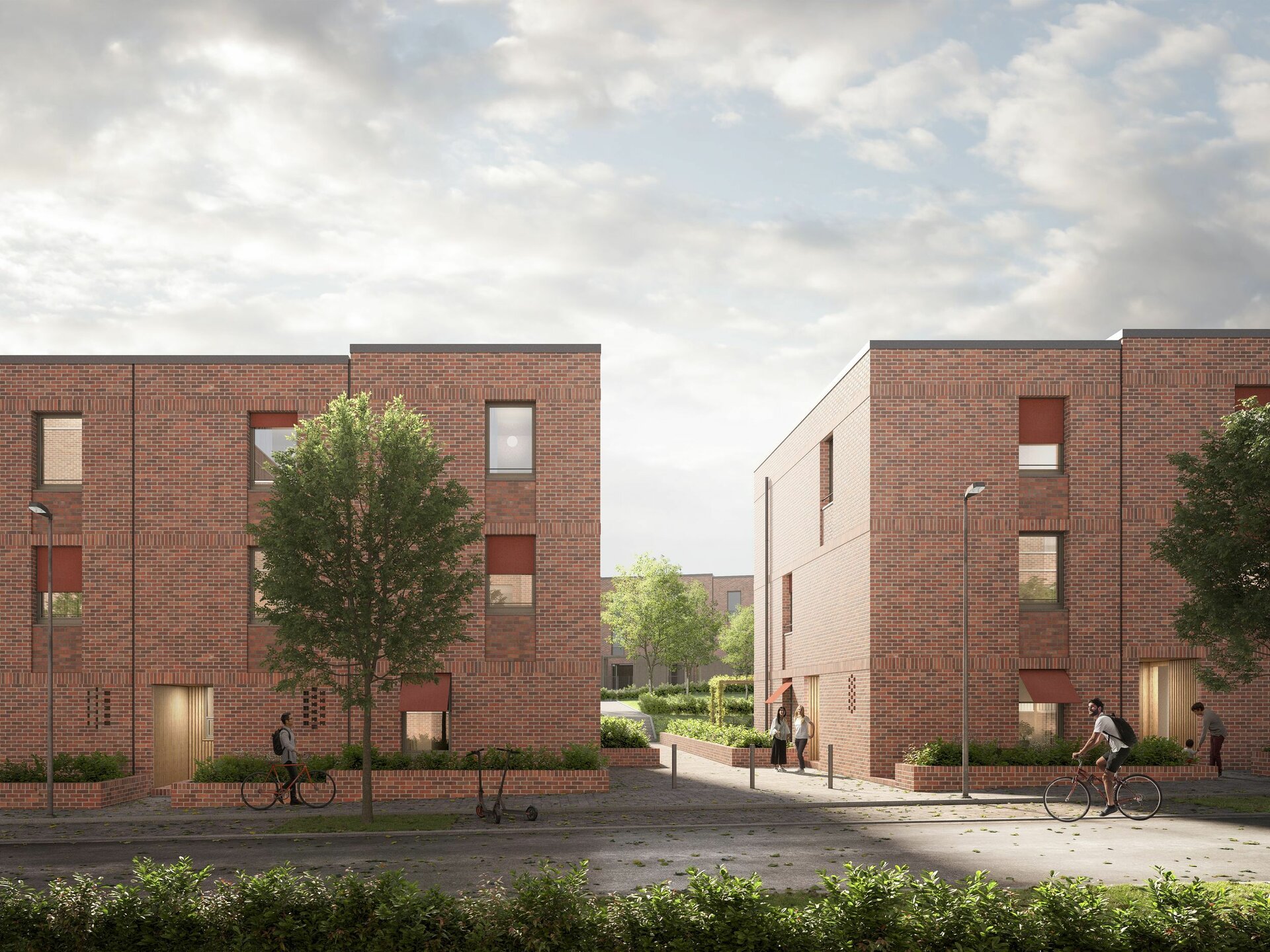 Die großzügig gestalteten Außenanlagen, entworfen von den renommierten nsp Landschaftsarchitekten, bieten Ihnen Raum für Erholung und Begegnung. Betonsitzblöcke, Spielplätze und Sitzbänke laden zum Verweilen und zum Austausch mit Nachbarn ein – ein Quartier, in dem Sie sich von Anfang an zuhause fühlen.
