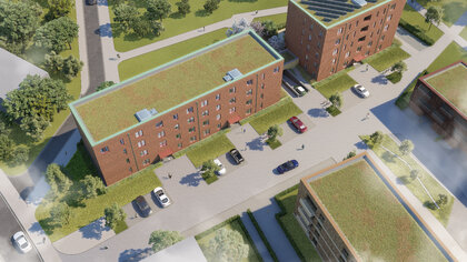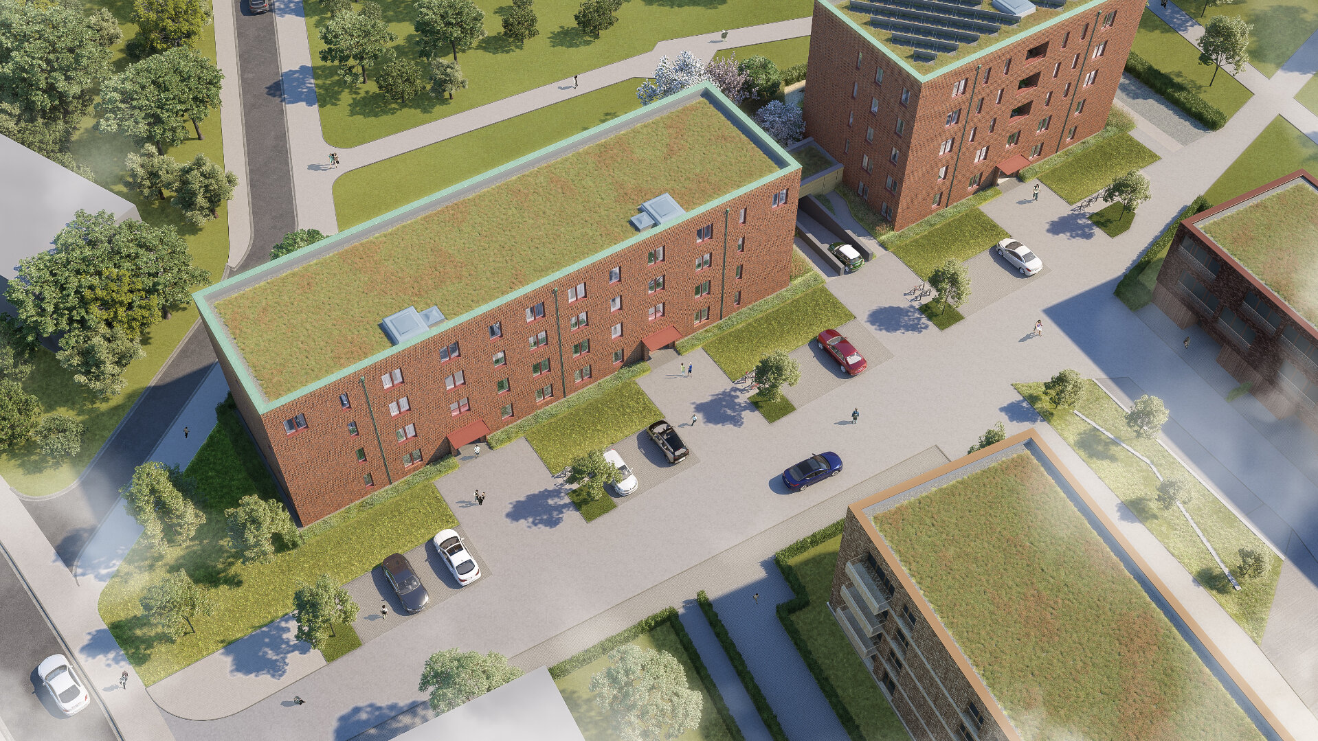 Extensiv begrünte Dächer, die für die Aufnahme von Fotovoltaikanlagen vorbereitet sind, runden das harmonische Gesamtbild ab.