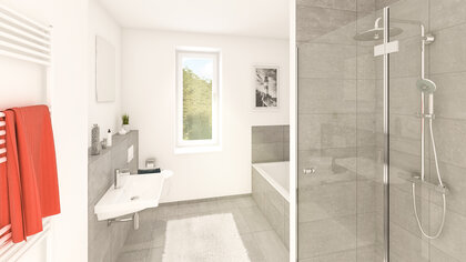 - Gehobene Ausstattung: hochwertige Fliesen in Natursteinoptik, Weitzer Parkett, bodengleich geflieste Duschen, Design-Badaccessoires