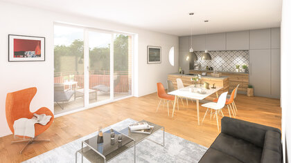 Die Ausstattung der Wohnungen besteht aus vielen geschmackvollen Details und konnte teils individuell gewählt werden: hochwertige Fliesen in Natursteinoptik, Weitzer Parkett, bodengleich geflieste Duschen, Design-Badaccessoires. Im Erdgeschoss gibt es elektrische Rollläden, im Dachgeschoss Lichtkuppeln. Dreifach verglaste Fenster und die Komfort-Lüftungsanlage garantieren den KfW Effizienzhaus 40-Standard. Jede Wohnung verfügt über einen Balkon oder eine Terrasse mit schwellenarmem Austritt. Glasfaserleitungen, Multimedia-Verkabelung (CAT 7) und Video-Gegensprechanlage unterstreichen den modernen Anspruch des Hauses.