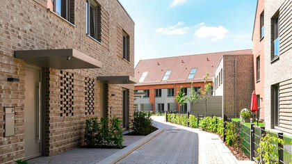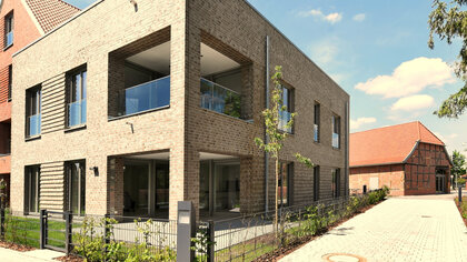Aufwendig gestaltete Freiflächen laden die neuen BewohnerInnen zum Verweilen ein. Ein echtes Schmuckstück stellen die denkmalgerechten Materialien wie etwa Rotbrandklinker im »Reichsformat« für die Scheune dar. Die Fassaden der Reihenhäuser korrespondieren hiermit in wertigem hellen Sandsteinklinker. Selbst im Garten sind historisierende Anklänge zu entdecken – wie etwa die Teilfläche aus historischem Originalpflaster.