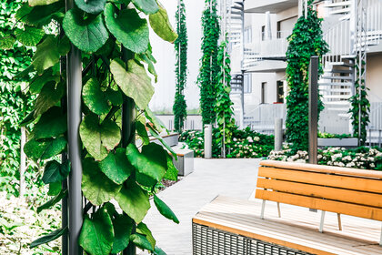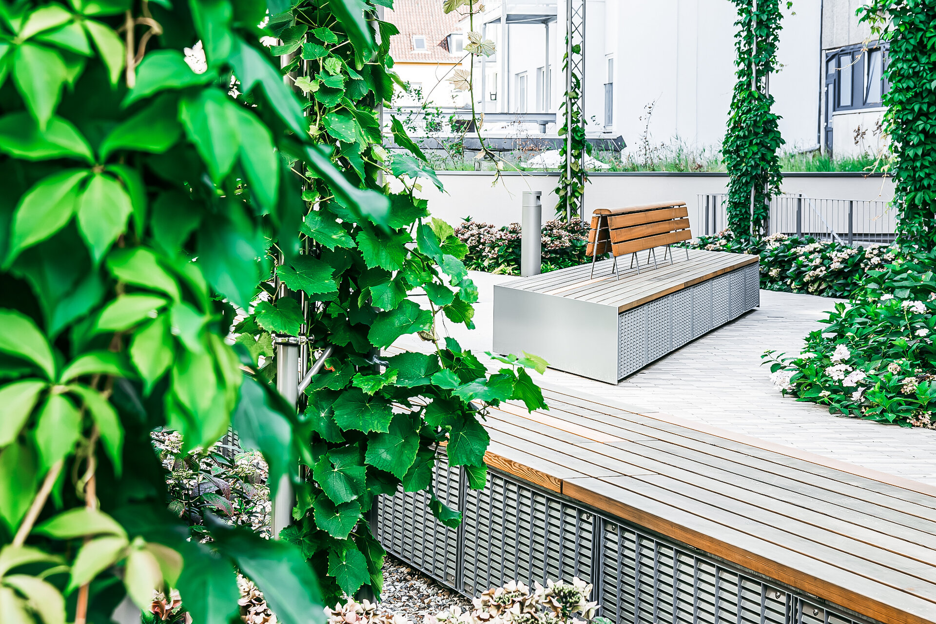 Genießen Sie den grünen Innenhof mit seinen Blüh- und Grünpflanzen. Ein Insektenhotel für Wildbienen haben wir ebenfalls aufgestellt.