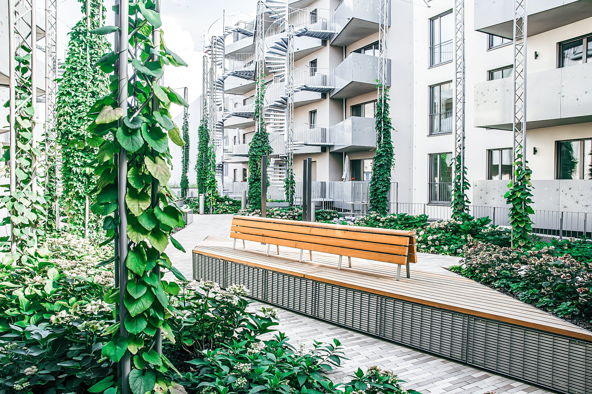 Extensive Dachbegrünung auf allen Flachdächern bietet eine verbesserte Wärmedämmung im Winter und dient als Hitzeschild im Sommer.