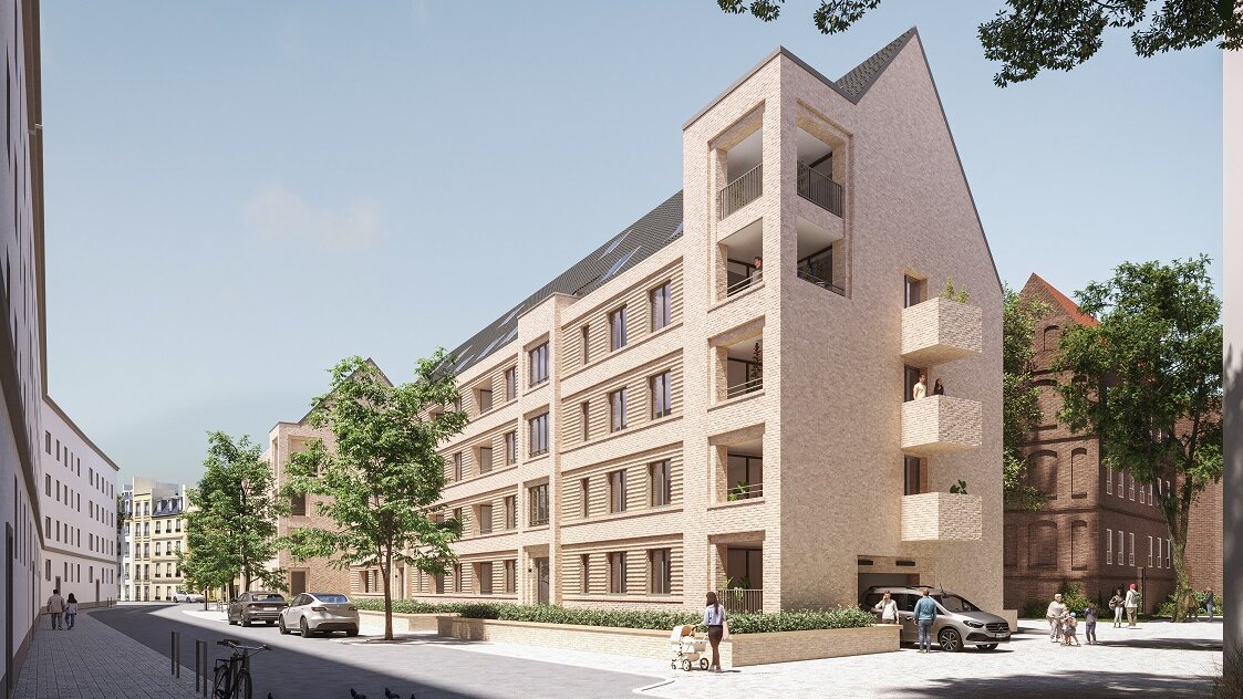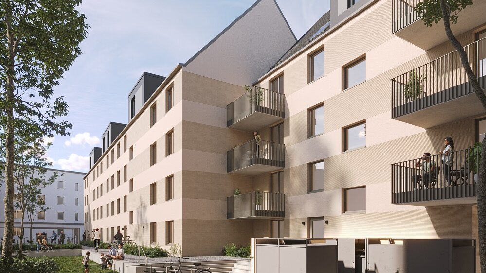 - Ausgezeichnete Architektur: Die renommierten Architekten Pape + Pape haben die Jury in einem Architektenwettbewerb mit ihrem Entwurf für das neue Wohngebäude überzeugt. Die Gebäudearchitektur fügt sich harmonisch in die vorhandene Bebauung ein und besticht durch ihre charakteristische Fassadengestaltung aus Verblendmauerwerk. Im Erdgeschoss sorgen Vorgärten und der begrünte Innenhof für eine ruhige und private Atmosphäre. Hier verschmelzen modernes Design und naturnahe Elemente zu einer besonderen Wohnqualität.