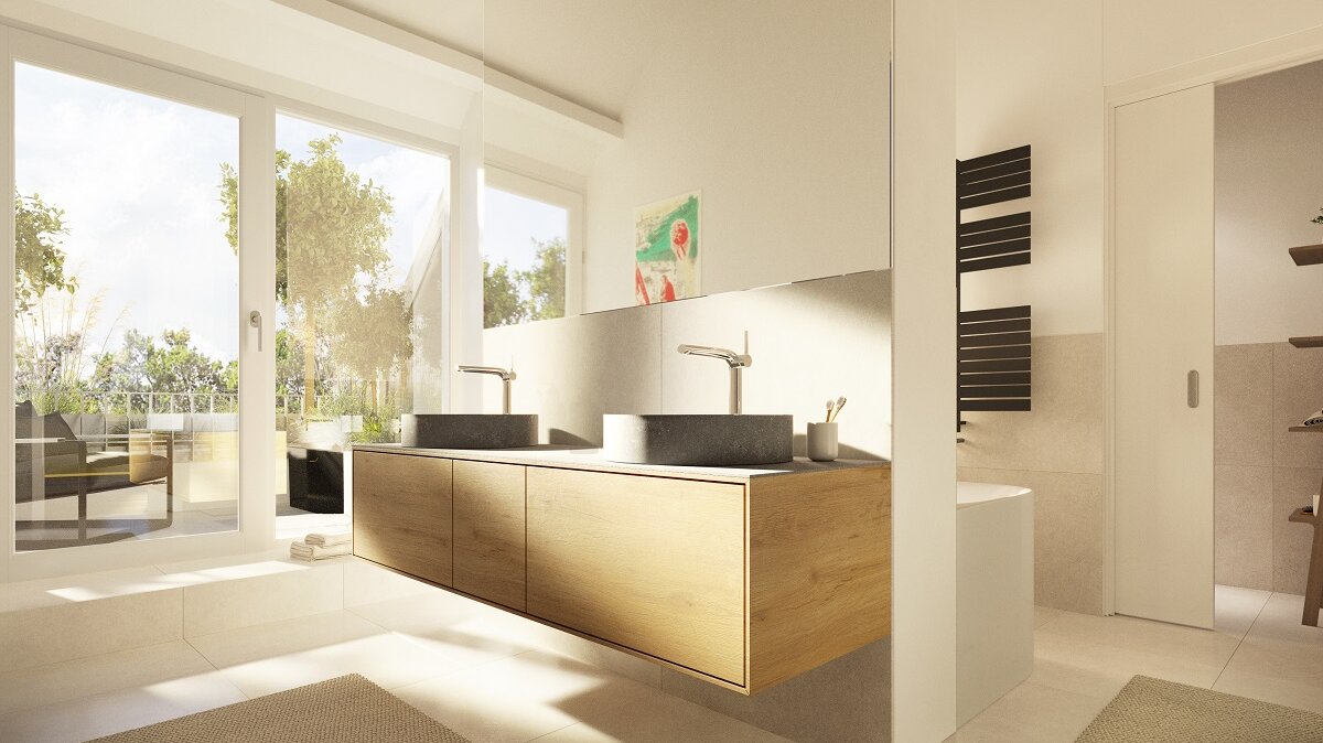 - Hochwertige Ausstattung: Sie legen Wert auf Qualität, hochwertige Materialien und beste Verarbeitung? Bei uns bekommen Sie eine Immobilie, die einfach klasse ist. Unsere Eigentumswohnungen sind mit einem Weitzer Eichendielen-Parkett und hochwertigen Natursteinfliesen ausgestattet. In den Bädern sind bereits hochwertige Design-Badaccessoires (inklusive Spiegel und Spiegelleuchte) angebracht, wenn Sie in Ihr neues Zuhause ziehen. Die Duschen im Bad mit Ganzglastüren sind für einen barrierefreien Zugang bodengleich gefliest. In allen Räumen sorgt eine Fußbodenheizung für angenehme Wärme, im Bad wärmt ein zusätzlicher Wandheizkörper Ihre Handtücher vor. Wände und Decken sind mit Malervlies tapeziert – dies schafft eine glatte und gleichmäßige Oberfläche. Mit der Video-Türsprechanlage sehen Sie bequem, welche Besucher:innen an der Hauseingangstür klingeln. Für den sommerlichen Wärmeschutz werden außenliegende Textilscreens im Bereich der Fenster der Loggien und Dachterrassen als Sonnenschutz eingebaut. Alle anderen Fenster erhalten ein innenliegendes Rollo. Die Wohnungen mit Loggien und Terrassen verfügen zudem über einen schwellenarmen Austritt. Zur zusätzlichen Ausstattung gehören eine Tiefgarage, die stressfreies Parken ermöglicht, sowie private Kellerräume für zusätzlichen Stauraum.