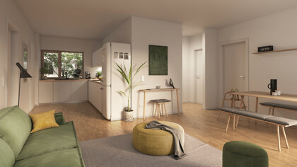 Unsere hochwertigen Mietwohnungen zeichnen sich durch eine kompakte Raumaufteilung, moderne Ausstattung und eine energieeffiziente Bauweise aus. Beim Bau haben wir auf den Einsatz wohngesunder und ökologischer Materialien geachtet. Die Wohnungen erreichen den KfW 55 Standard für ein energieeffizientes Haus und sind damit besonders gut gedämmt. Die Wohnräume sind mit Parkettböden ausgestattet, die für ein angenehmes Wohngefühl sorgen. Im Küchenbereich und in den Bädern wurden Fliesen verlegt – komfortabel sind auch die bodengleich gefliesten Duschen. Ein Waschmaschinenanschluss befindet sich ebenfalls in jeder Wohnung. Mit einer Loggia oder einem Balkon ist ein Teil der Wohnungen ausgestattet, um entspannte Stunden im Freien genießen zu können.