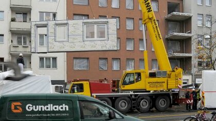 In nur zwei Tagen, vom 10. auf den 11.November 2010, wurden die Holzelemente auf der Straßenseite der 295 m² Fassade der Hildesheimerstraße 80 komplett montiert. Die Holzelemente ecoPro 190, eine Konstruktion des renommierten Ökohaus-Produzenten Baufritz, sind mit dicken Dämmschichten aus Holzspänen gefüllt. Ihre integrierten Fenstern und Balkontüren sind als passivhaustaugliche Bauteile dreischeibig verglast und mit mehreren Lippendichtungen versehen. Ihr Wärmedurchgangskoeffizient (U-Wert) beträgt nur 0,8 W/m²K, der Sollwert nach EnEV 2009: 1,30 W/m²K. Die anschließenden Trockenbauarbeiten wurden am 22. Dezember 2010 abgeschlossen .