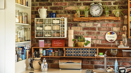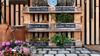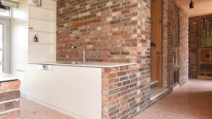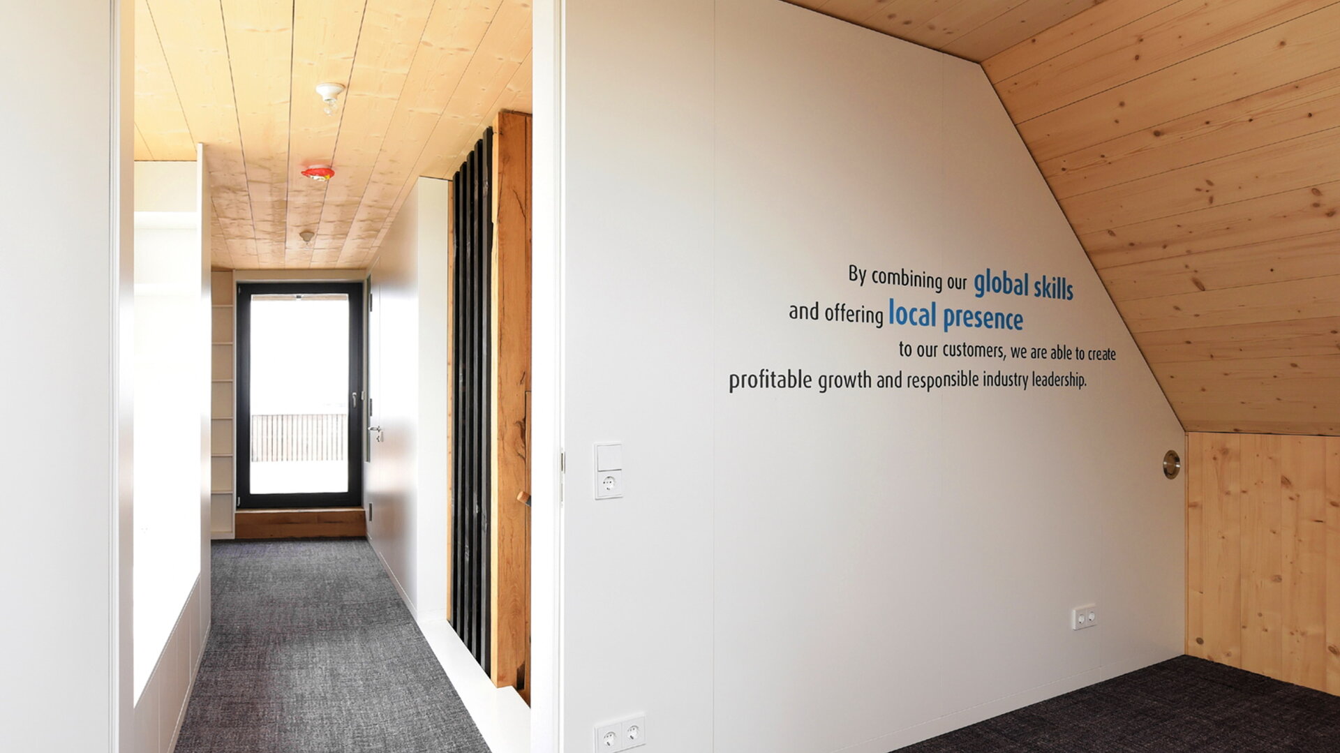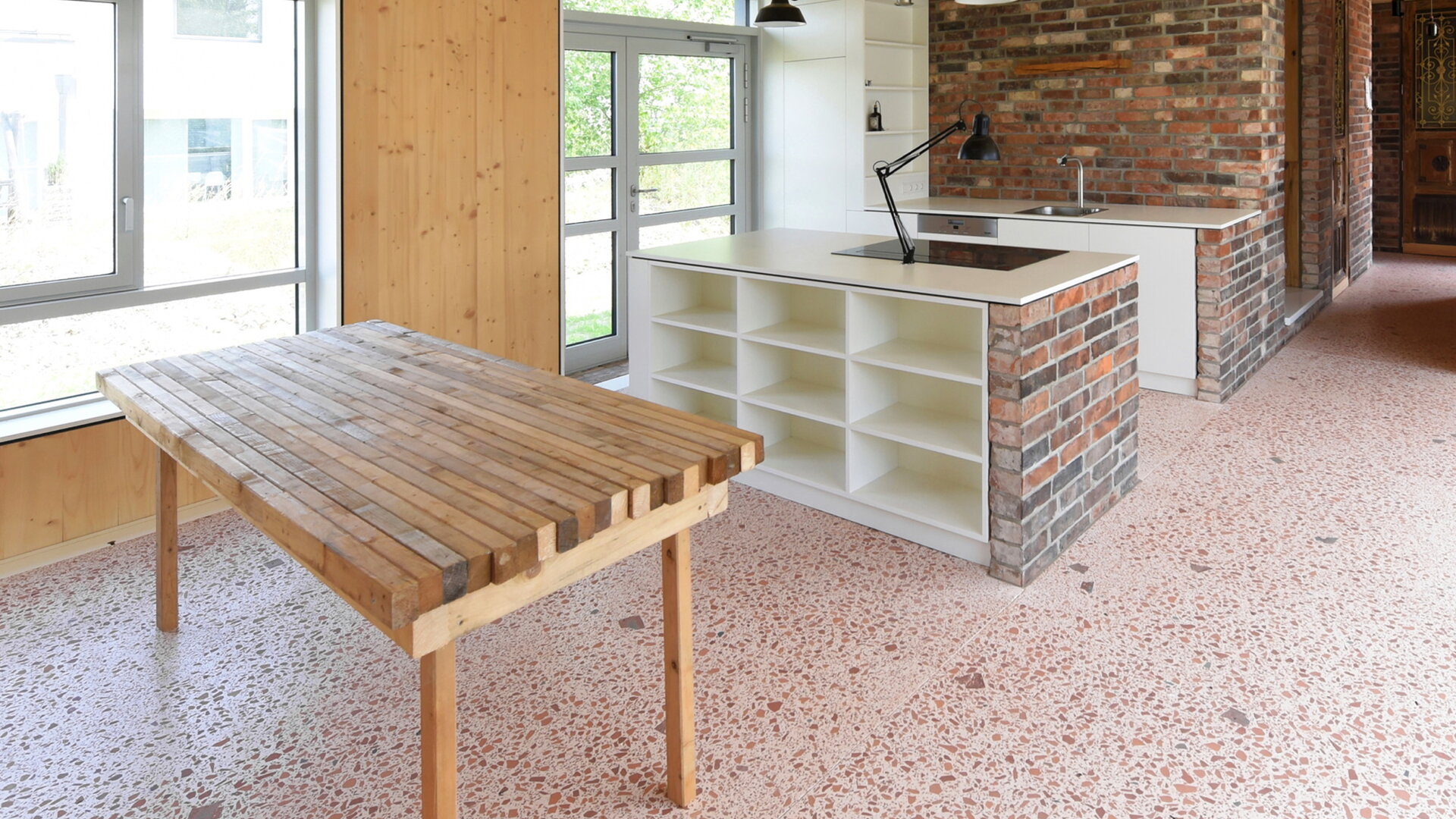 Im Inneren schaffen die Ziegelsteine aus einer abgerissenen Scheune ein Gefühl von Zuhause und Geborgenheit. An einer Wand im Obergeschoss ist von „global skills“ und „local precense“ die Rede, aber nicht weil die Mieter:innen das dorthin geschrieben haben. Die Wand wurde wie viele weitere Einbauschränke oder Türen im „ersten Leben“ im Messebau genutzt.
