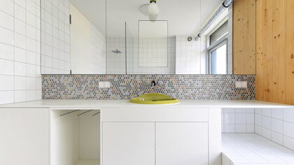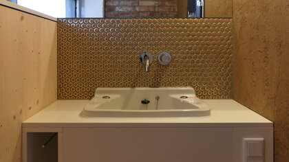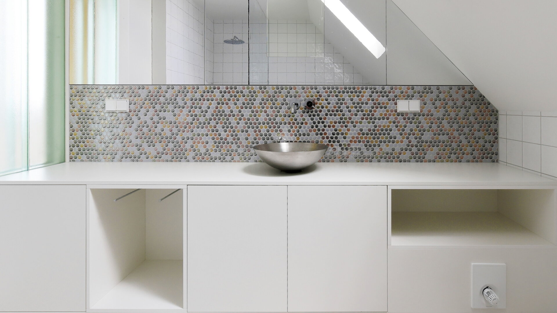 Das Bad ist mit Kronkorken eines Burger-Restaurants verziert, die als Waschbecken genutzte Schüssel stand zuvor in einem Sportcenter. „Wenn man im Haus steht, merkt man nicht, dass vieles aus zweiter Hand kommt. Es hat eine besondere Atmosphäre und seinen ganz eigenen architektonischen Charme“, sagt Franz Gerbens, Ökologiebeauftragter bei Gundlach.