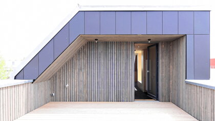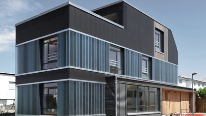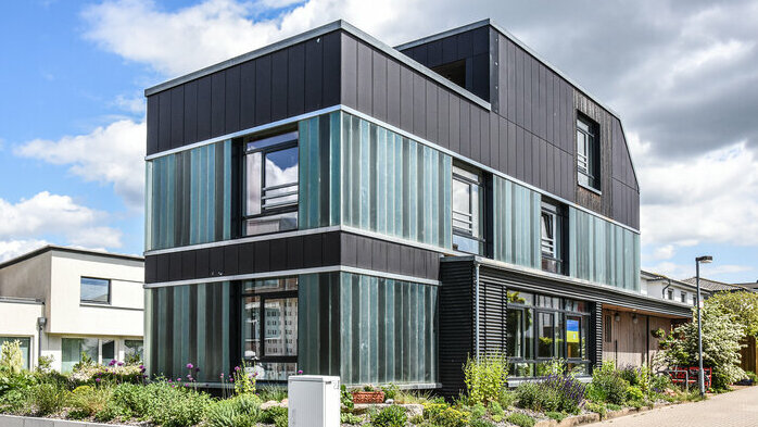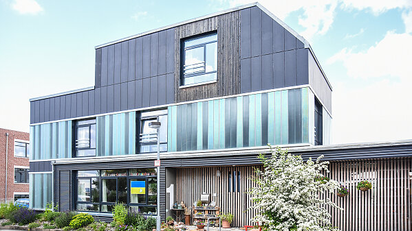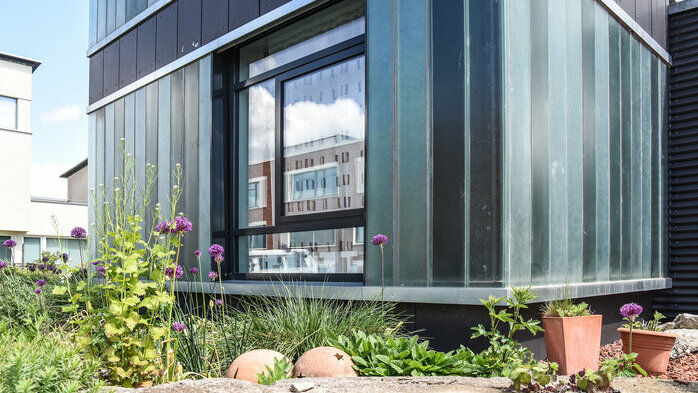 Denn es konnte nur mit dem gearbeitet werden, was an „Abfällen“ in der Region Hannover übrig war. Einige Materialien wie etwa die Baustoffe für die Fassade musste sich Gundlach frühzeitig sichern. „Der Ausbau von Materialien ist viel teurer als der einfache Abriss eines Gebäudes“, erklärt Stubendorff. Ins Auge fällt direkt die grünlich-bläuliche Glas-Fassade in den unteren Stockwerken. Diese alten Profilbaugläser stammen aus einer abgerissenen Lackiererei ganz in der Nähe. Darüber erheben sich schwarze Faserzementplatten – sie hatten unbelastet von Schadstoffen in einem Freizeitheim für Jugendliche ausgedient.