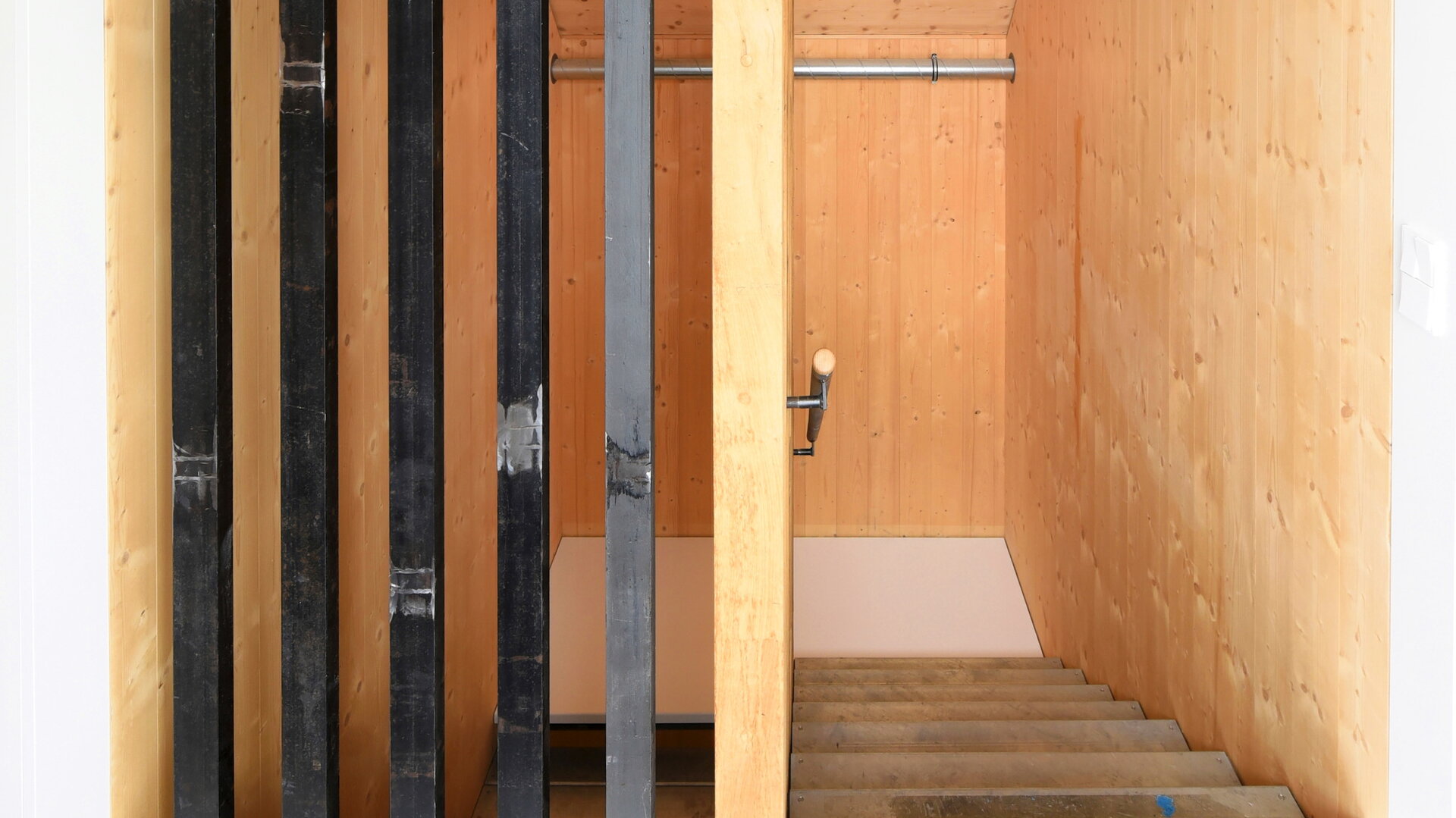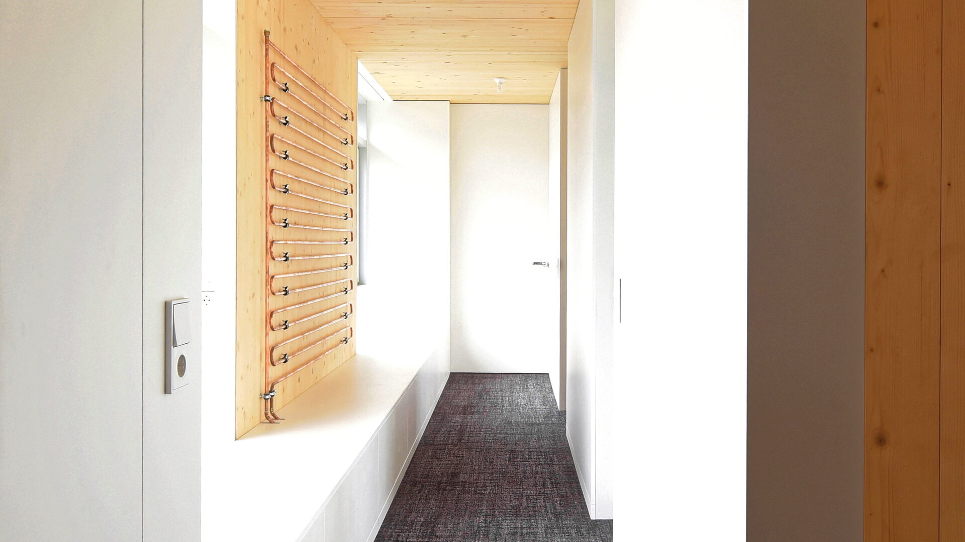 Zu einem perfekten Recyclinghaus gehört aber auch, dass die Baustoffe später einfach und leicht verwertet werden können, sollte das Gebäude irgendwann mal seinen Zweck erfüllt haben. Der Rohbau aus leimfreien Massivholz kann nach Ende seiner Lebensdauer ohne Qualitätsverlust recycelt werden. Andere Materialien wie zum Beispiel die Kupferohre der Heizung liegen offen an der Wand – und sind daher einfach auszubauen. „Wir haben durch das Projekt viel Zuversicht mitgenommen, dass man auch mit alternativen Materialien etwas schaffen kann. Recycling wird für uns und die Branche immer wichtiger“, betont Stubendorff.