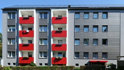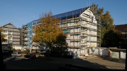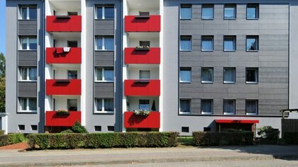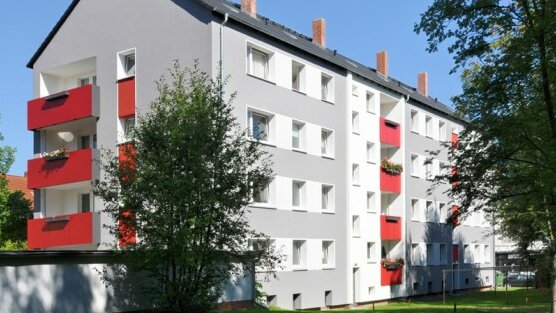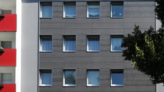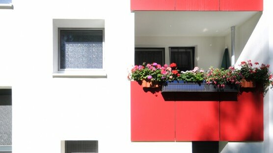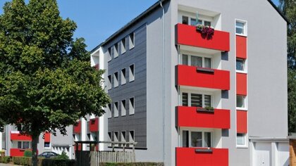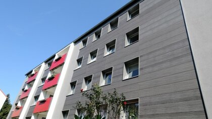 Die Dachböden der zwei Mehrfamilienhäuser in der Richard Lattorf Straße 23-25 und 27-29, Baujahr 1962, mit 32 Wohnungen wurden bereits 2010 mit einer 20cm Wärme- dämmung versehen. Für den effektiven Wärmeschutz der Fassaden sorgt jetzt das Sto-Therm-Cell-Wärmedämm-Verbundsystem. Diese umweltfreundlichen, frei von schädlichen Treibhausgasen produzierten Wärmedämmplatten bestehen aus den natürlichen Komponenten Kalk, Zement, Quarzsand sowie einer wässrigen Hydrophobierung (wasserabweisend) und sind 100 Prozent recyclebar. Die Straßenfassaden der Häuser wurden zusätzlich mit Fassadenplatten ergänzt. Die Mineralwolleplatten bestehen aus Basalt, einem Vulkangestein mit hervorragenden Dämm- und Witterungseigenschaften und sind ebenfalls vollkommen recyclingfähig. Alle Balkone wurden vergrößert neu aufgebaut. Mit ihren in Rottönen verkleideten Zementfaserplatten geben sie der Fassade Struktur und ein frisches Gesicht. Die Dächer beider Häuser wurden komplett neu eingedeckt.